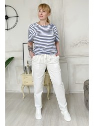 Брюки женские из текстильной ткани (джинс) слегка заужены к низу. По переду расположены накладные карманы. Вверх брюк обработан поясом с широкой резинкой. В пояс вставлена тесьма.