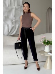 Брюки женские из текстильной ткани (вельвет-штрукс), слегка заужены к низу. В боковых швах расположены карманы. По низу передних половинок есть защип. Задняя половинка брюк с отрезной кокеткой и накладными карманами. Вверх брюк обработан поясом с резинкой (без молнии).
