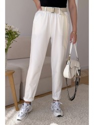 Брюки женские из трикотажной хлопковой ткани (двунитка), слегка заужены к низу. В боковых швах расположены карманы. По низу передних половинок есть защип. Задняя половинка брюк с отрезной кокеткой и накладными карманами. Вверх брюк обработан поясом с резинкой (без молнии).