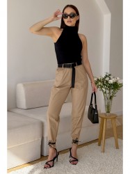 Брюки женские из текстильной ткани, слегка заужены к низу. В боковых швах расположены карманы. По низу передних половинок есть защип. Задняя половинка брюк с отрезной кокеткой и накладными карманами. Вверх брюк обработан поясом с резинкой (без молнии).