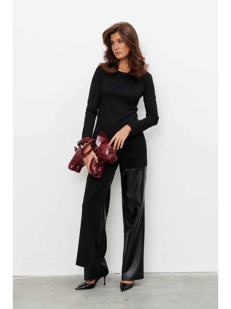 Оформить заказ →Брюки прямого силуэта выполнены на сочетании плотного джинса и экокожи. Брюки на поясе со шлёвками и застежкой на металлические пуговицы-болты. По переду два прорезных кармана, по спинке - два накладных.