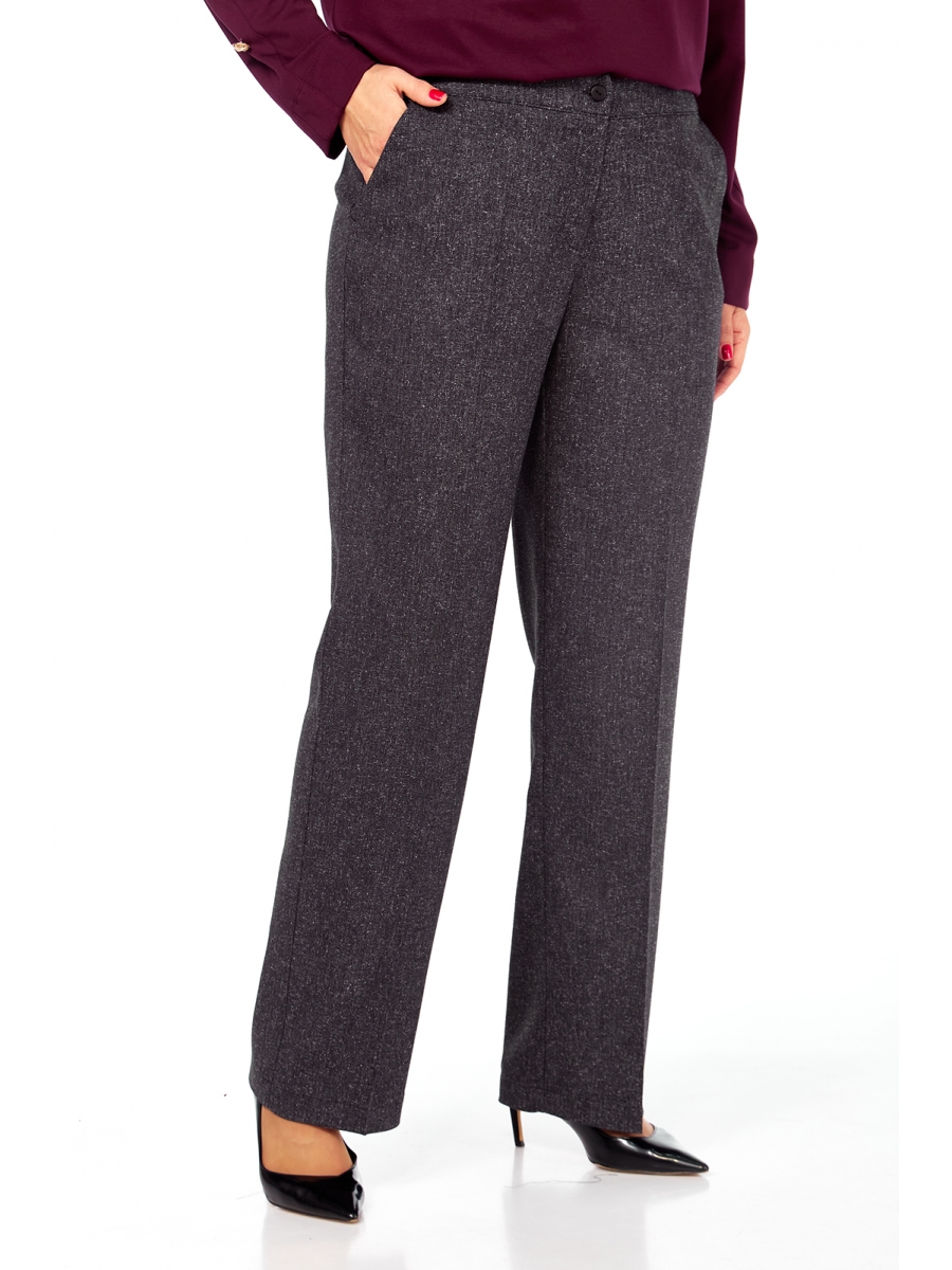 Брюки женские, выполнены из костюмной ткани, пояс притачной частично на резинке. Застежка на тесьму-молнию и петлю-пуговицу. В брюках обработаны карманы.