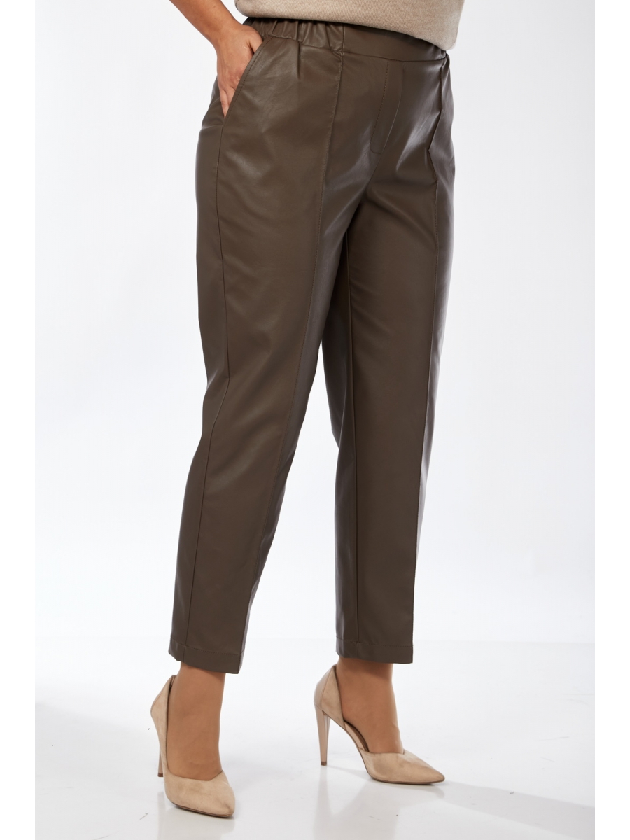 Брюки женские, классической посадки, немного заужены к низу, выполнены из экокожи. По передним деталям брюк обработаны карманы с подрезным бочком и застрочены стрелки. Пояс притачной на эластичной тесьме.