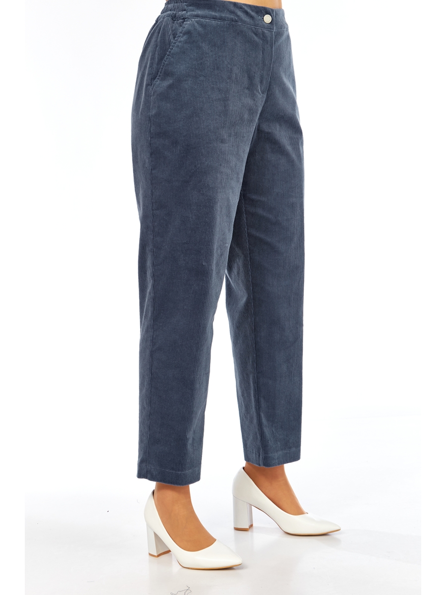 Брюки женские, свободного силуэта, выполнены из хлопкового вельвета. Пояс притачной, частично на резинке. Застежка на молнию, петлю и пуговицу. В передних деталях брюк обработаны боковые карманы с подрезным бочком.