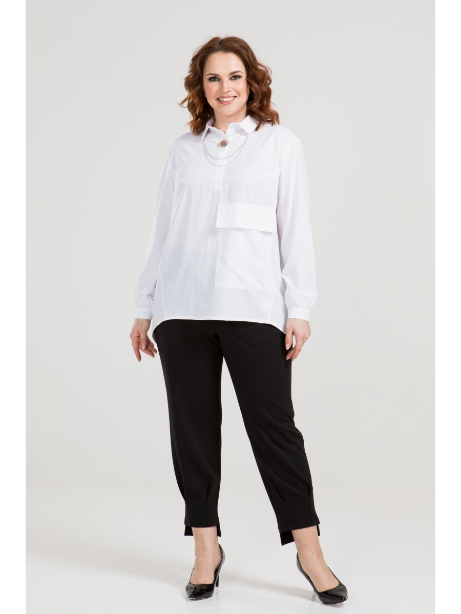 Брюки женские свободного силуэта, укороченные, разноуровневые ( задняя деталь брюк длиннее передней на 4,0 см ) Перед с боковыми карманами и одним маленьким накладным карманом с правой стороны. Спинка с кокеткой и накладными двумя накладными карманами. По низу передней половинке брюк две встречные застроченные складки. Верх на притачном поясе эластичной тесьмой.