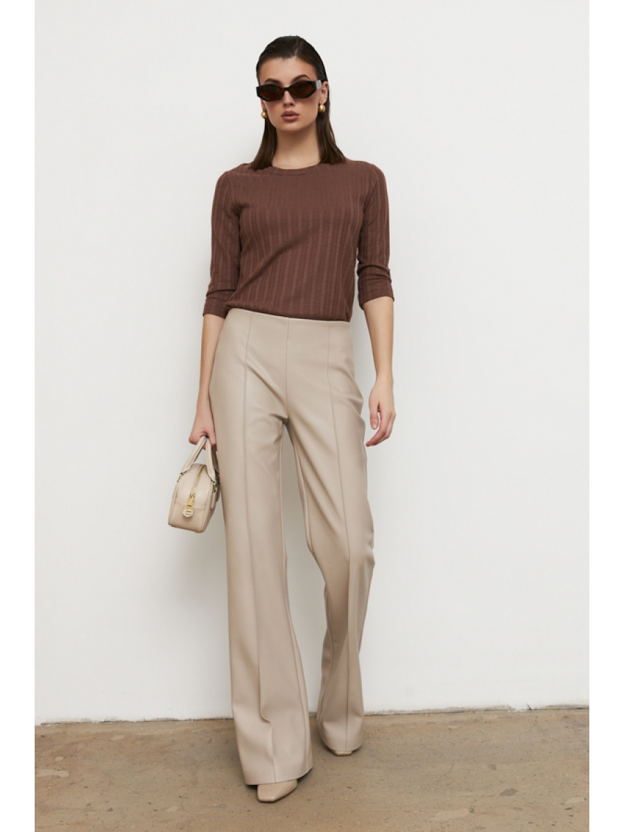 Брюки, зауженные в области колена и расклешённые книзу из эластичного полотна, с покрытием, имитирующим кожу. На задней части брюк по талии выполнены две вытачки. На передней части застрочены стрелки. Брюки без пояса на обтачке. В боковом шве потайная молния.