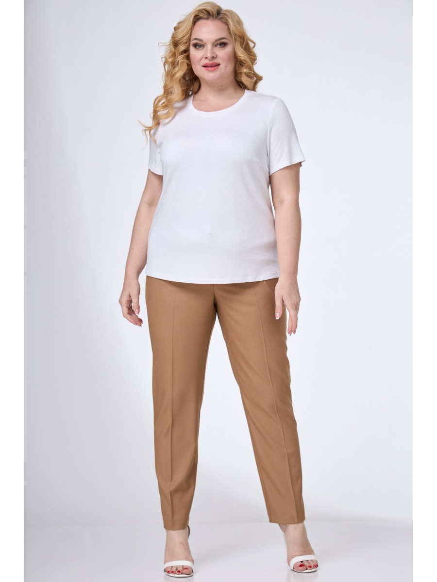 Брюки зауженные книзу с высокой талией на притачном поясе с застежкой на пуговицу. По задним половинкам собраны на эластичную тесьму, которая делает их комфортными и удобными для любых размеров. Передние половинки с наклонными карманами и застежкой на молнию в среднем шве. На задних половинках вытачки.