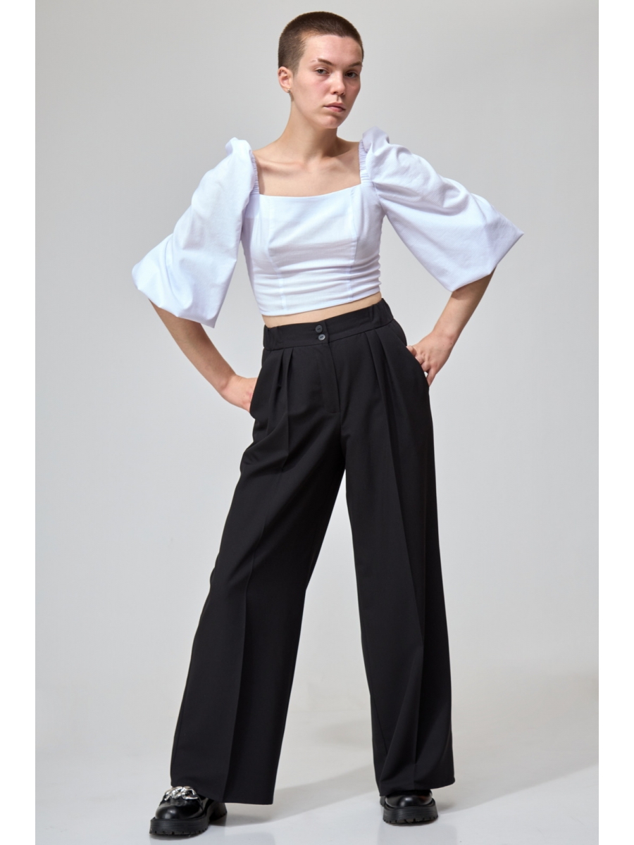 Брюки широкие длинные, с заутюженными стрелками, с высокой посадкой. На передних половинках складки. Пояс притачной с застежкой на молнию, петли и пуговицы, со вставками эластичной тесьмы по бокам. В боковых швах расположены карманы с косым входом.