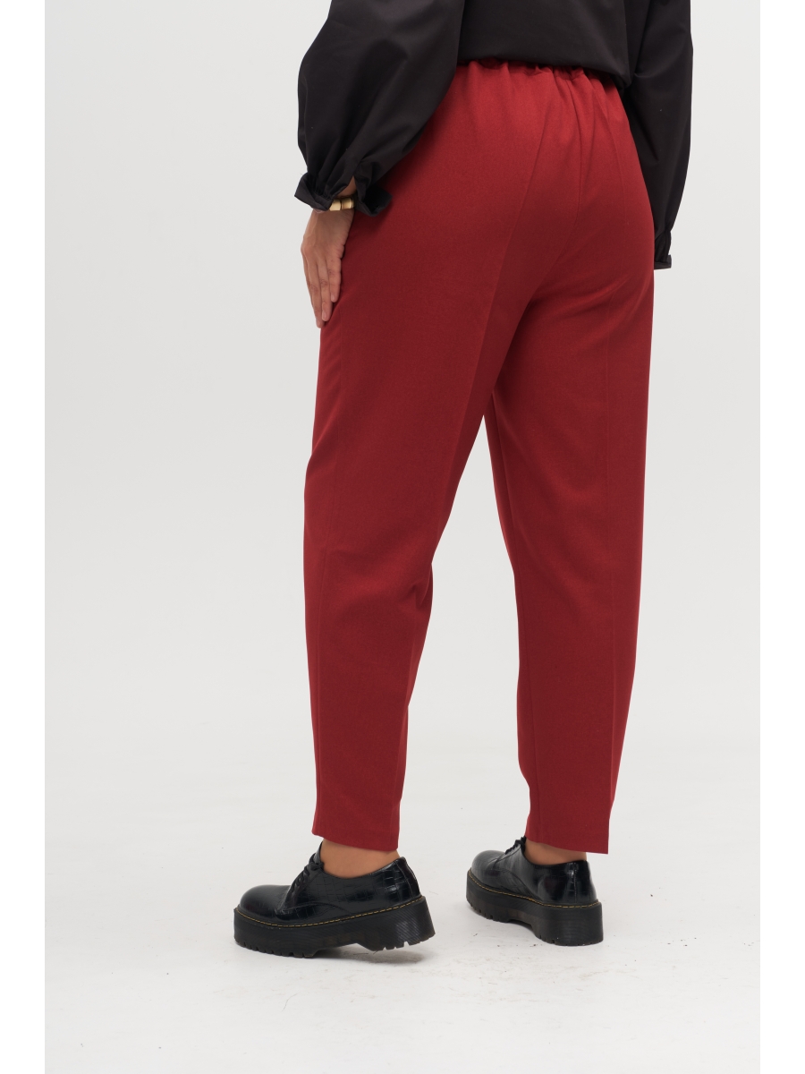 Брюки ддиной по щиколотку, на передних частях брюк обработаны боковые карманы с наклонным входом, на брюках заутюжены стрелки, переходящие в складку по линии талии на передних частях.