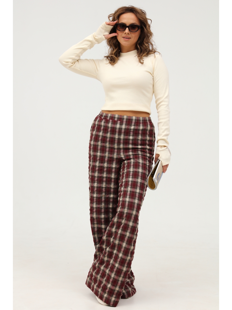 Широкие брюки в клетку - стильный элемент для создания запоминающегося образа в пижамном стиле. Свободный крой брюк создаст эффект свободы, пояс на резинке обеспечит максимальный комфорт, а ткань с "крэш" эффектом подарит легкость и практичность. Брюки подойдут для повседневной жизни и активного отдыха, будут незаменимы в путешествии и отпуске. Брюки широкие прямые с высокой посадкой. Пояс брюк на широкой резинке. В боковых швах имеются функциональные наклонные карманы.