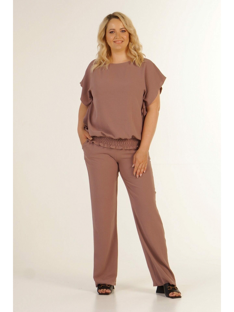 Стильные брюки, модель трубы. Выполнены из эластичной плательной ткани турецкого плотного шифона. Расцветка кофейный. Пояс на широкой резинке. Клёш от бедра. С карманами. Прекрасно подойдет для летних прогулок и для повседневной носки. Рекомендуемая стирка при t не более 30. ДИ в 48-64 р 108 см. Рост модели 168 размер 52