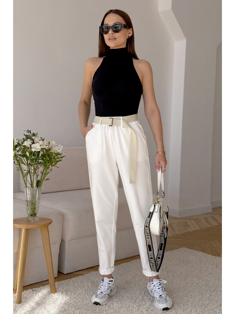 Брюки женские из трикотажной хлопковой ткани (двунитка), слегка заужены к низу. В боковых швах расположены карманы. По низу передних половинок есть защип. Задняя половинка брюк с отрезной кокеткой и накладными карманами. Вверх брюк обработан поясом с резинкой (без молнии).