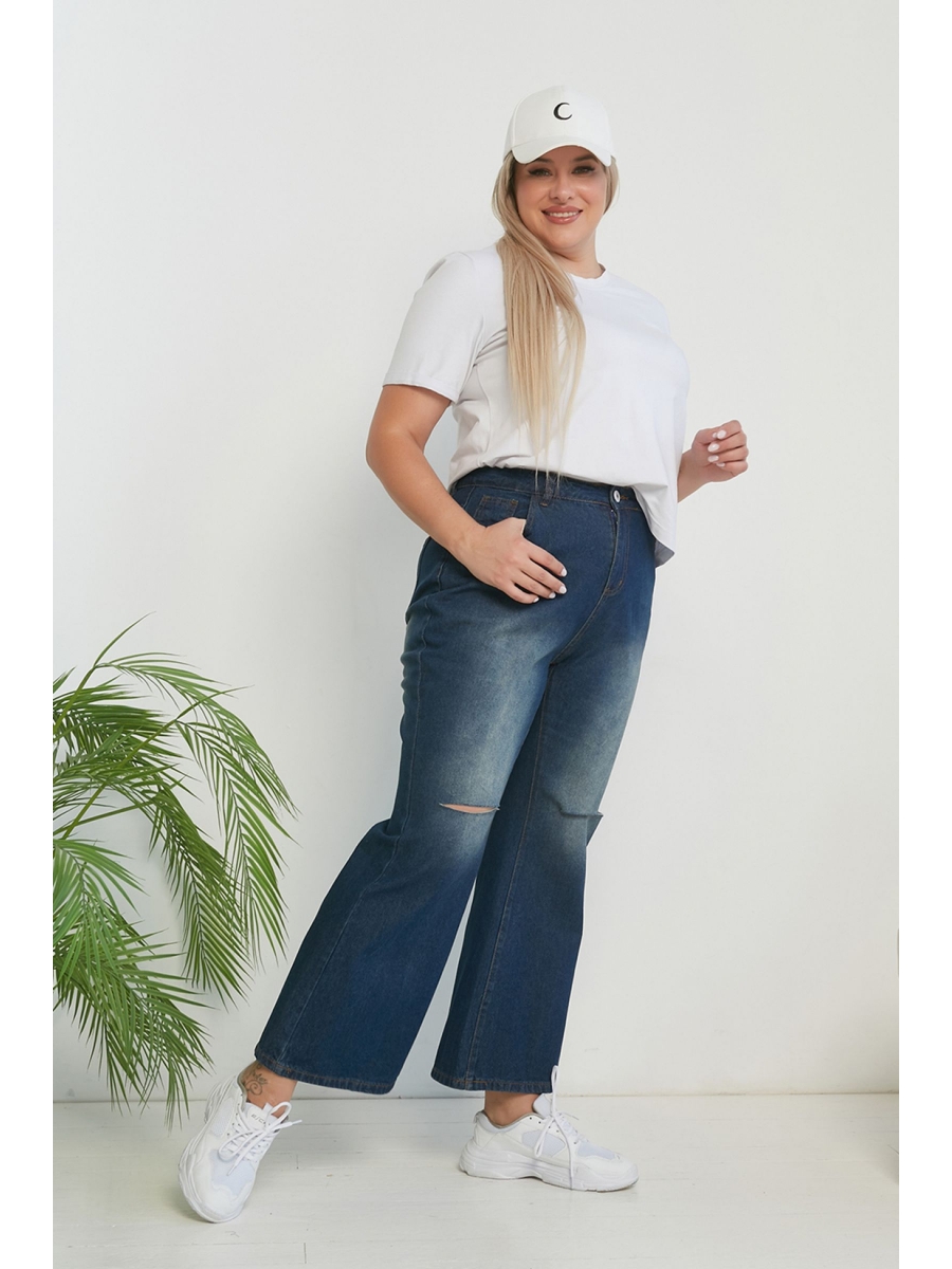 Стильные джинсы-клеш с рваными коленями, выполнены из плотной хлопковой ткани. Модель с комфортной высокой посадкой и поясом, дополненным шлевками. По центру застежка - гульфик на молнию и пуговицу. По переду удобные карманы с подрезным бочком, на задних половинках накладные карманы