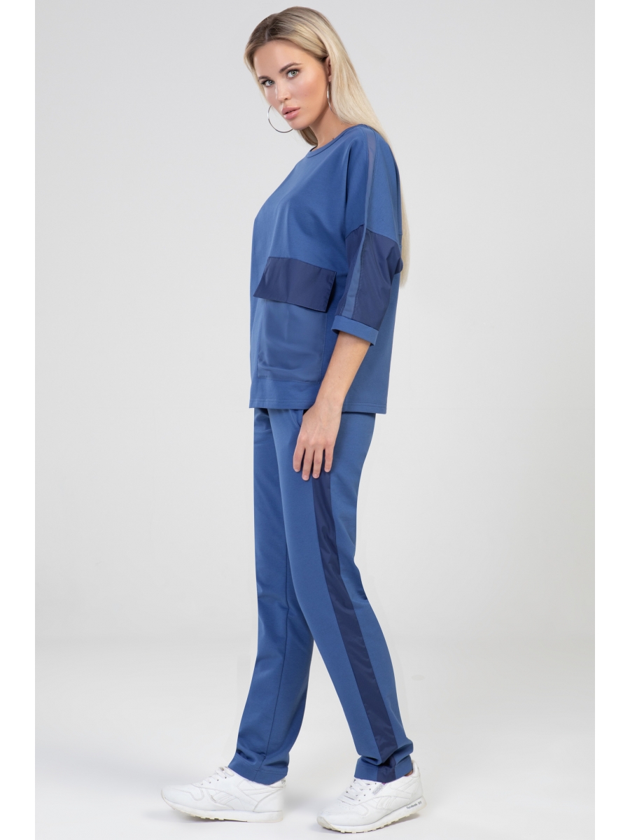 Брюки прямого силуэта с лампасами и карманами в боковом шве. Верх брюк на притачном поясе с эластичной тесьмой. Лампасы выполнены из тонкой плащевой ткани в тон основного сырья. Цвет индиго.