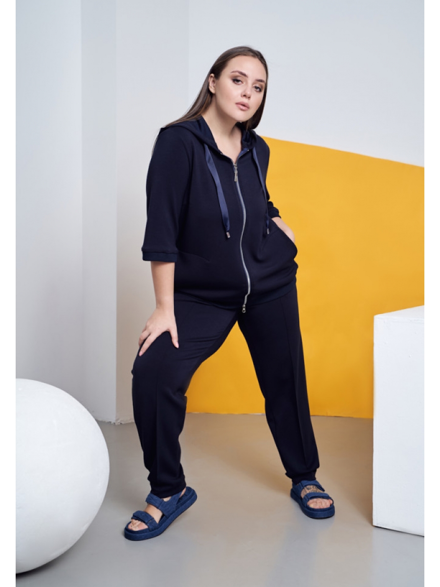 Брюки в спортивно-элегантном стиле со стрелками из премиального вискозного трикотажа. Пояс на резинке, боковые карманы украшены итальянской тонкой металлизированной тесьмой. На поясе - серебряные люверсы и затяжка на атласную ленту.