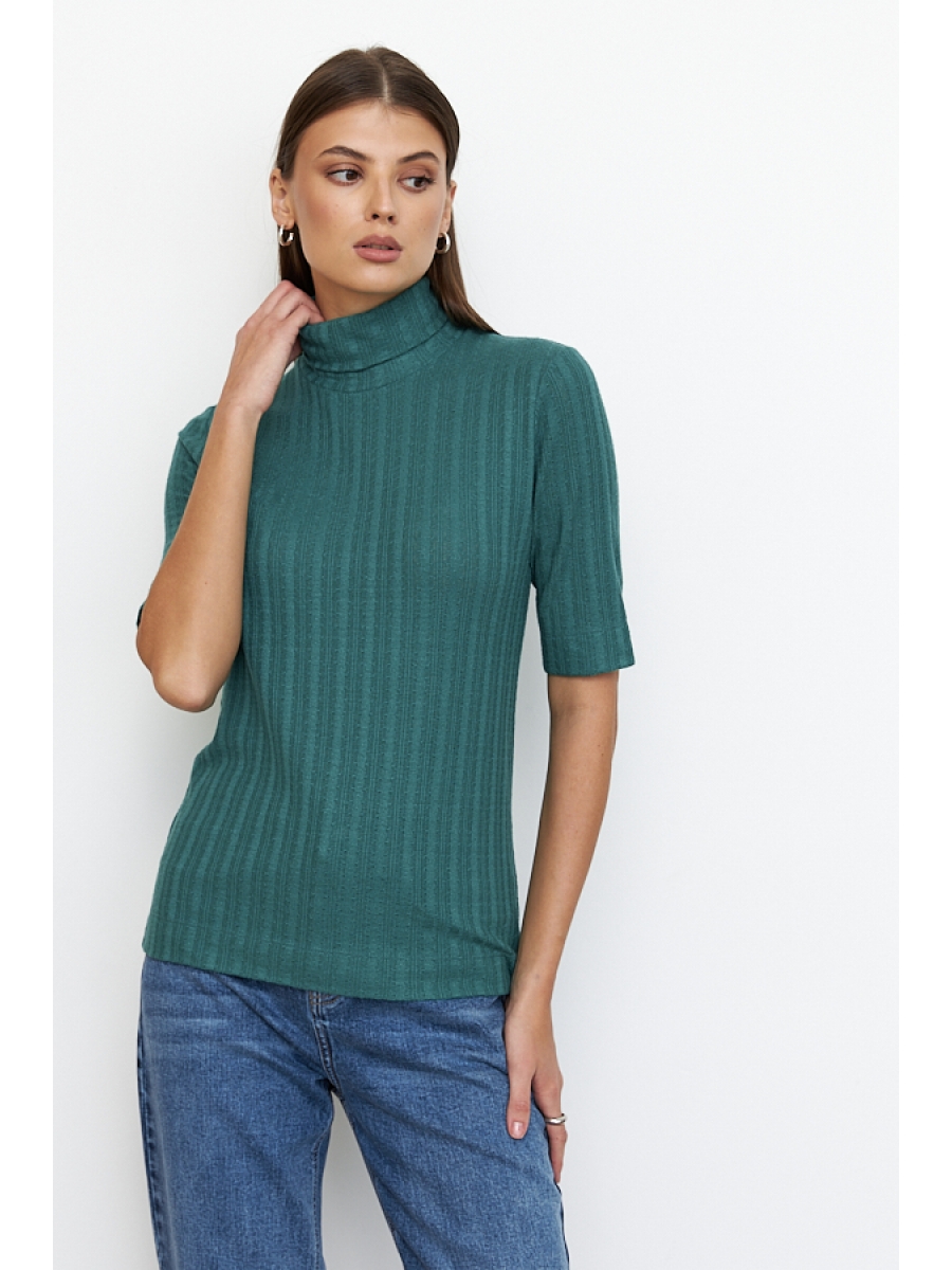 Джемпер прилегающего силуэта из фактурного эластичного полотна. Втачной короткий рукав. Вырез горловины высокая стойка. Джемпер – это хорошая базовая вещь, подходящая для любого гардероба.