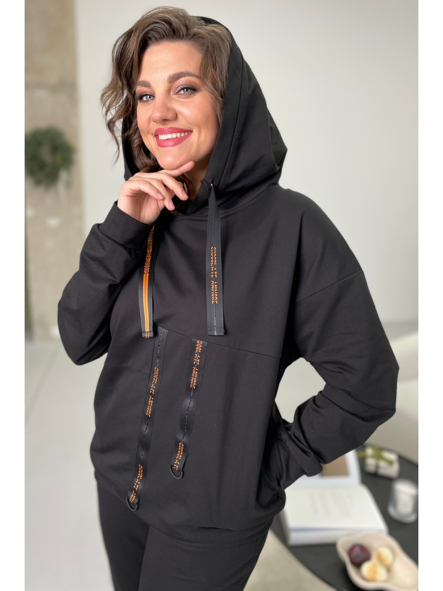 Худи женское из трикотажной ткани. Перед худи с декоротивными подрезами и настрочной тесьмой с полукольцами. В боковых швах расположены карманы. Рукав со спущенным плечом. Низ рукава обработан манжетой,низ изделия обработан притачной планкой. Вырез горловины худи оформлен капюшоном. В притачную деталь капюшона вставлена декоротивная тесьма.