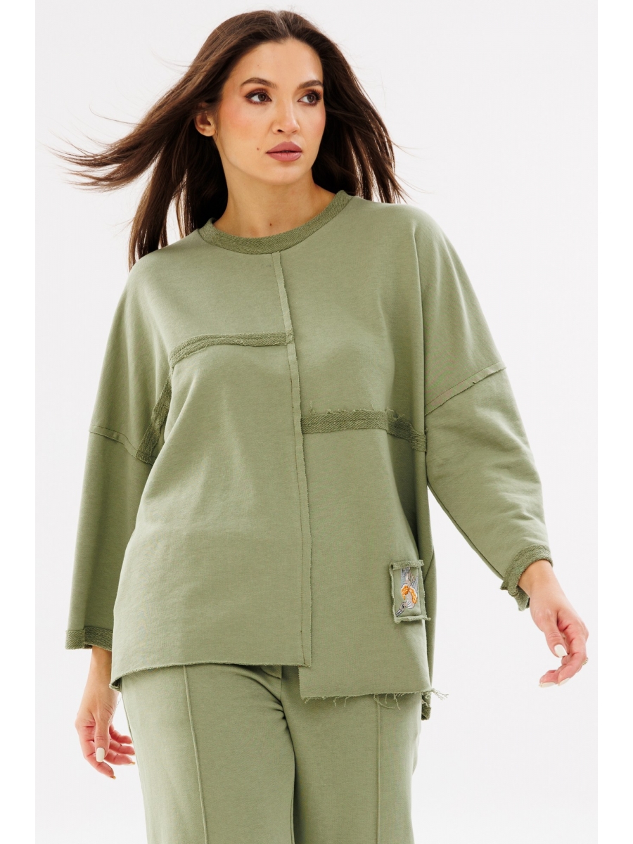 Перед и спинка с горизонтальными подрезами. Горловина округлой формы, обработана бейкой. На передней половинке имеется декоративная нашивка. Рукав втачной одношовный, линия рукава спущена. Низ свитшота фигурный.
