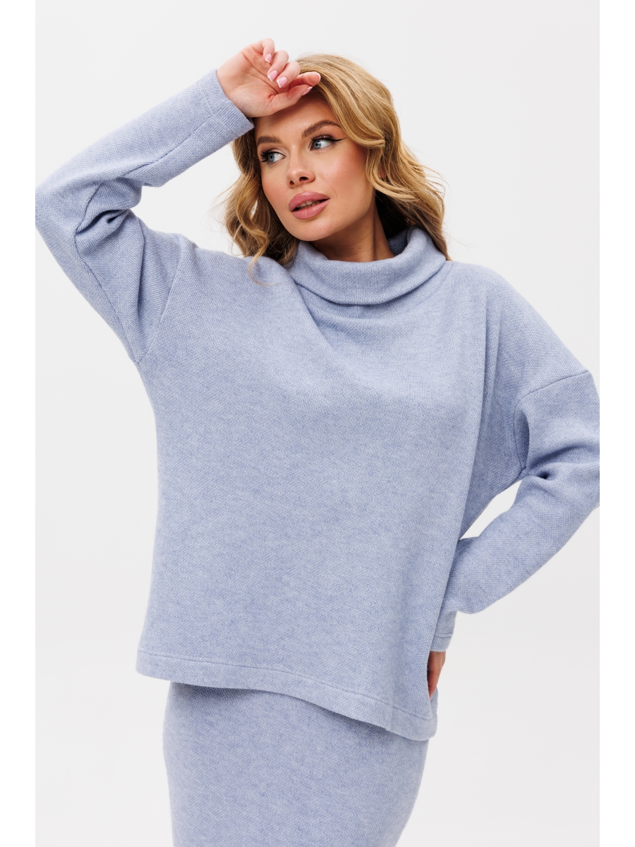 Джемпер свободного силуэта с отложной стойкой, спущенным плечом.