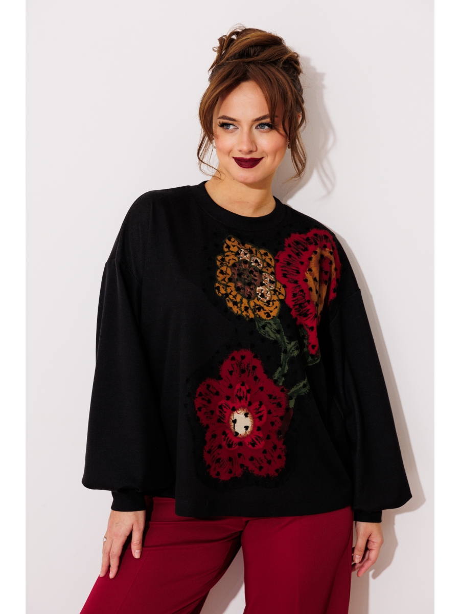 Джемпер свободного силуэта из трикотажной ткани с принтом. Рукав втачной одношовный со складками по низу и манжетой. Горловина обработана планкой. По переду поверх принта настрочена сетка с бархатным рисунком.
