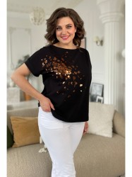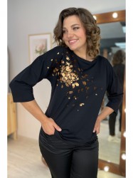 Джемпер женский из трикотажной ткани. По переду расположен принт. Спущенное плечо, рукав 3/4. Вырез горловины круглый, оформлен притачной бейкой.