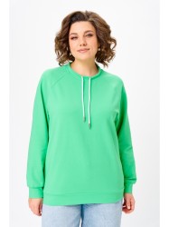Джемпер женский из трикотажной хлопковой ткани (двунитка). Рукав реглан. Низ рукава обработан притачной манжетой. Низ изделия оформлен притачным поясом. На спинке настрочен декоративный элемент. Вырез горловины круглый, обработан бейкой со шнуром.