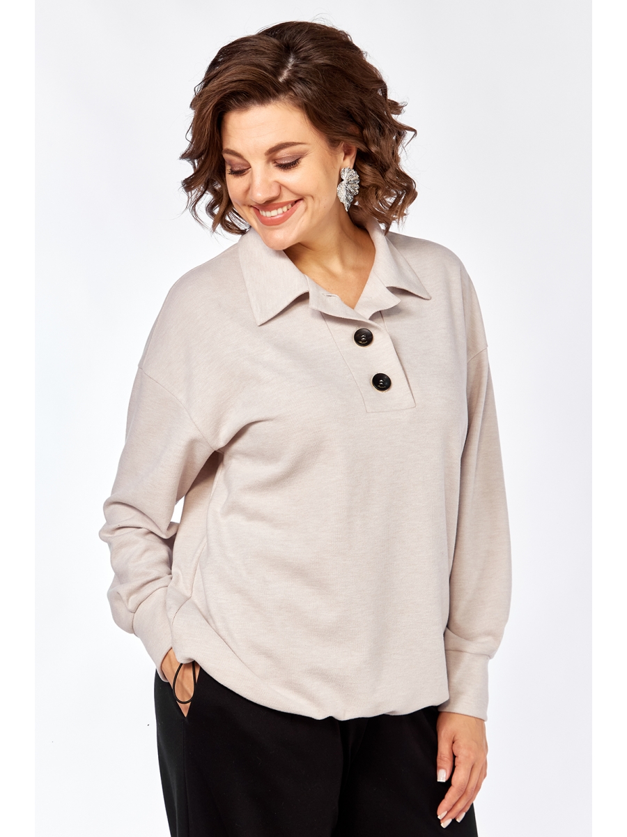 Джемпер свободного силуэта, выполнен из трикотажного полотна с воротником и застежкой “поло”. Рукава спущенные на манжетах. По низу изделия обработана кулиса с резинкой и фиксатором.