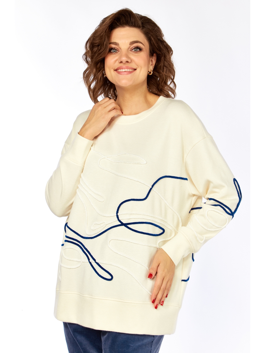 Джемпер женский свободного кроя изготовлен из трикотажного полотна. Горловина круглой формы. На полочке, спинке и рукаве расположена вышивка шнуром. Рукава спущенные, с манжетами по низу.