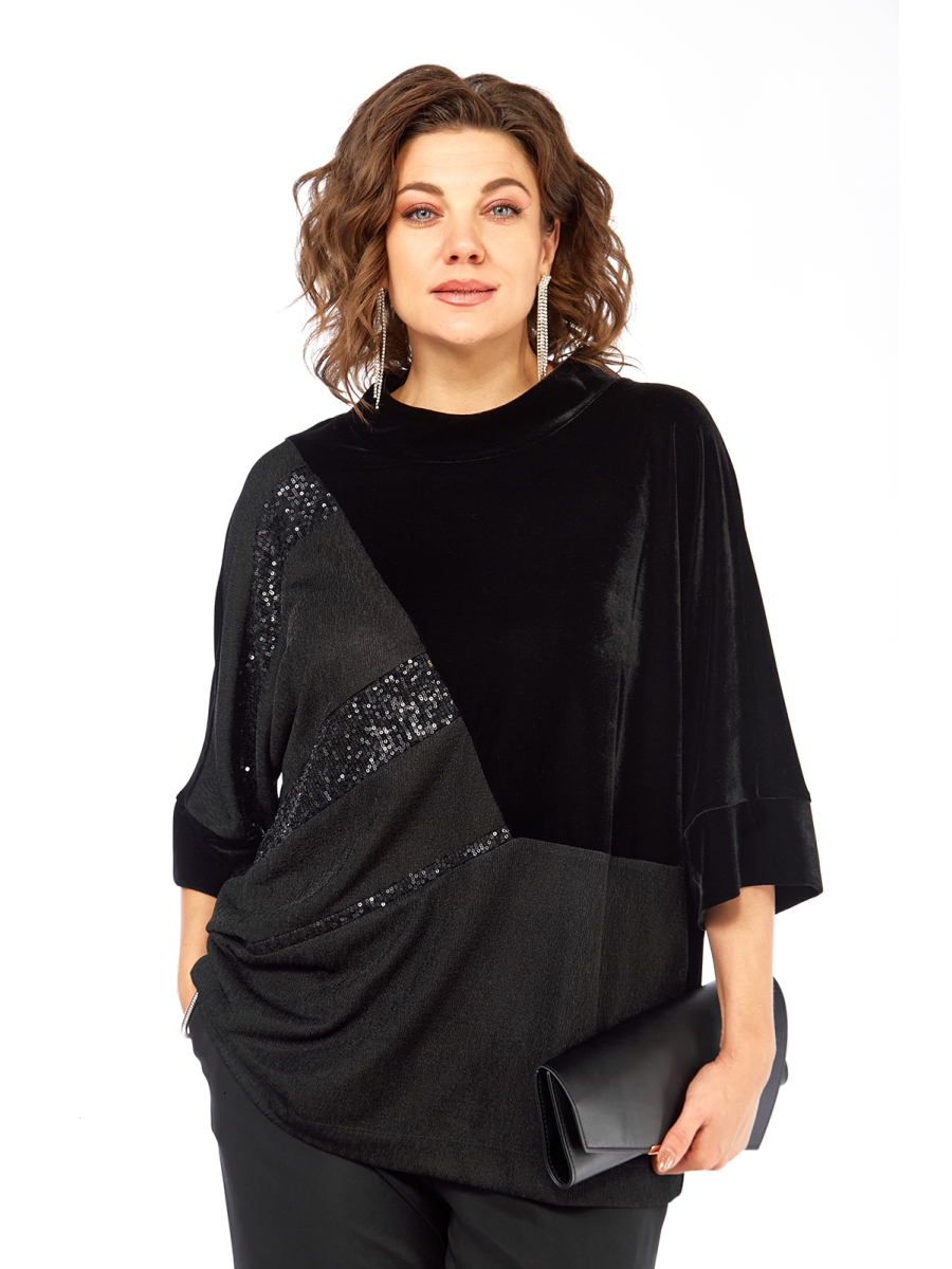 Джемпер женский, нарядный, свободного кроя. Выполнен путем комбинирования трикотажного полотна и бархата, с декоративными вставками пайеток по переду. Горловина обработана воротником стойкой. Рукава цельнокроеные с притачными манжетами.