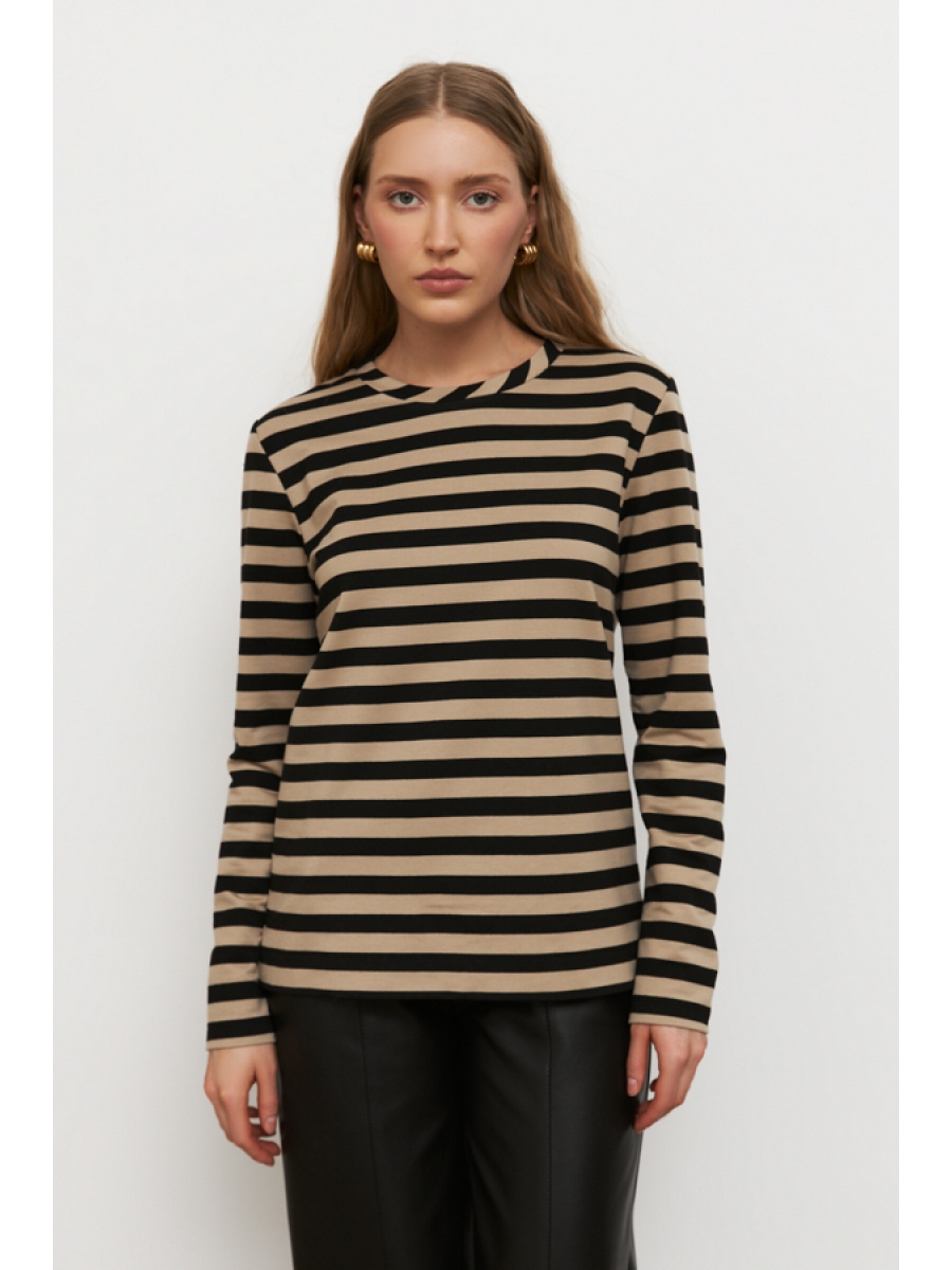 Джемпер свободного силуэта из эластичного полотна. Вырез горловины оформлен бейкой из основной ткани. Втачной длинный рукав.