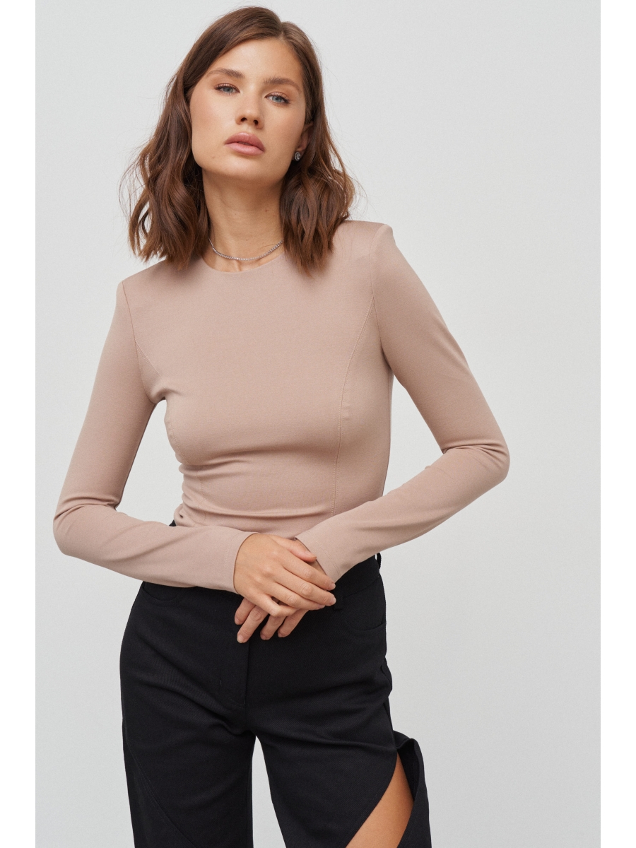 Джемпер из трикотажного полотна прилегающего силуэта с длинным рукавом и плечевыми накладками. По переду и спинке рельефы для плотного приталивания по фигуре. Вырез горловины круглый. Сзади застёжка на потайную молнию.