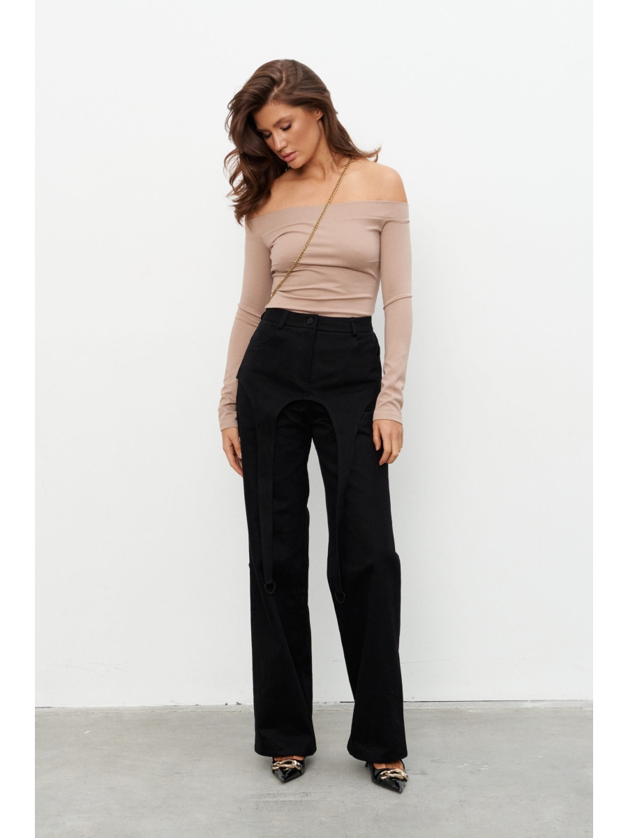 Джемпер из трикотажного полотна прилегающего силуэта с открытыми плечами. Отрезная деталь по верху изделия плотно фиксирует изделие на фигуре.