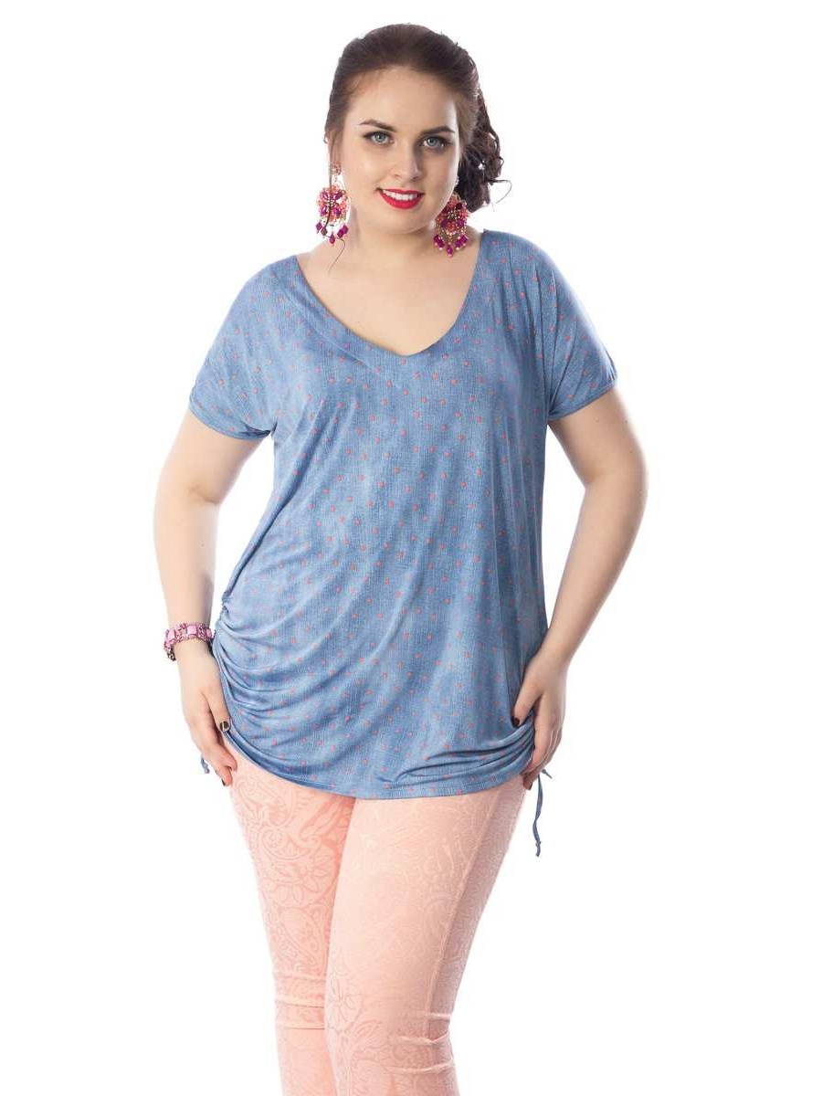 Повседневный джемпер свободного силуэта из трикотажного полотна голубо-розового цвета. V-образный вырез обработан внутренней обтачкой. Джемпер с цельнокроеными рукавами. По боковым швам декоративные «кулиски», которые создают напуск и вертикальные сборки.
