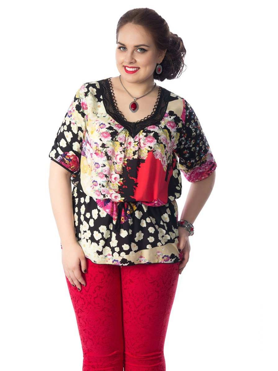 Яркая блузка свободного силуэта из текстильного полотна (штапель) бежево-черного цвета. Фигурный вырез изделия украшен декоративным элементом. Линия талии эффектно подчеркнута кулиской.