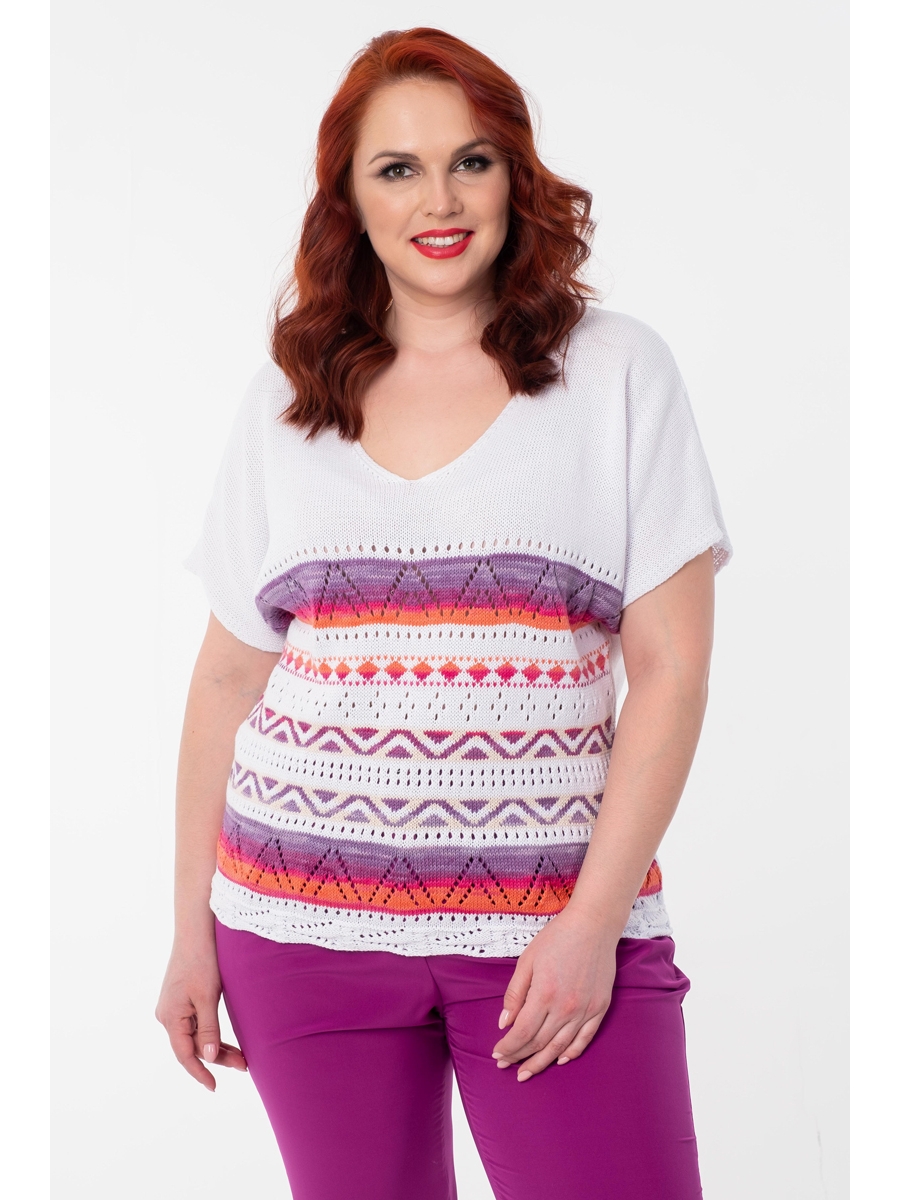 Романтичный джемпер полуприлегающего силуэта белого цвета, с цельнокроенными рукавами и V-образным вырезом. Джемпер выполнен в технике «ручного вязания» из натуральных нитей с содержанием хлопка. По переду изделия вывязан декоративный орнамент из разноцветных нитей. Аксессуары в комплект не входят.