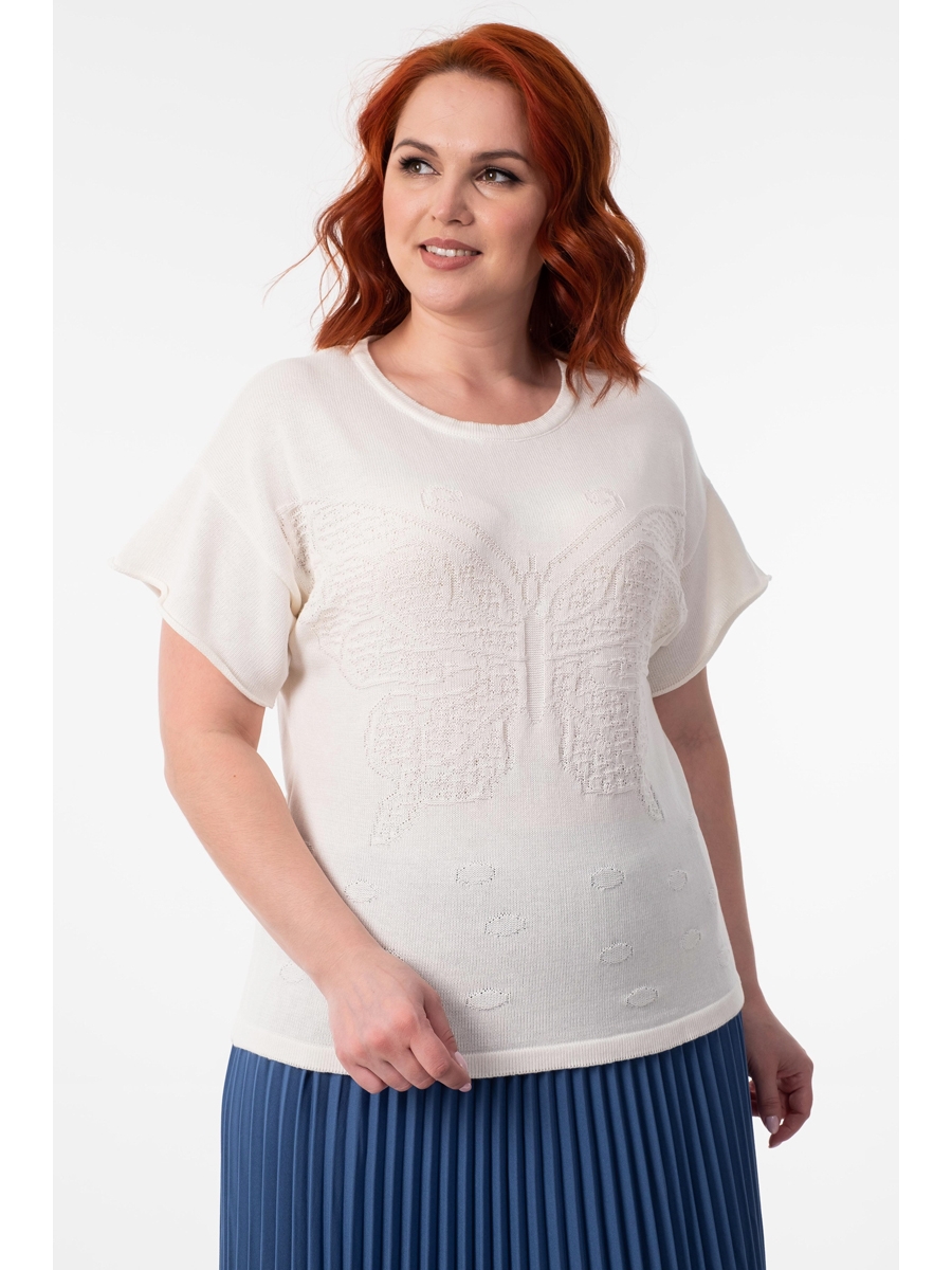 Эффектный джемпер полуприлегающего силуэта молочного цвета. Джемпер выполнен в технике ручного вязания из натуральных хлопковых нитей. Круглый вырез джемпера обработан двусторонней лицевой бейкой. Втачные рукава со спущенной линией проймы. По переду изделия вывязан рисунок.
