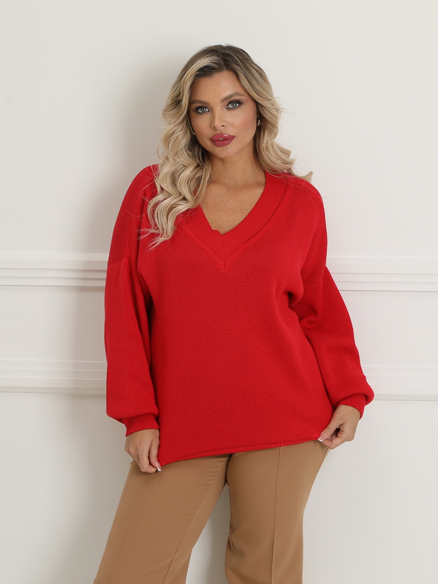 Эффектный джемпер свободного силуэта красного цвета. Джемпер выполнен в технике «ручного вязания» из натуральных хлопковых нитей. V-образный вырез изделия обработан двусторонней лицевой бейкой. Низ изделия и втачные рукава обработаны манжетами, выполненные в технике «резинка».