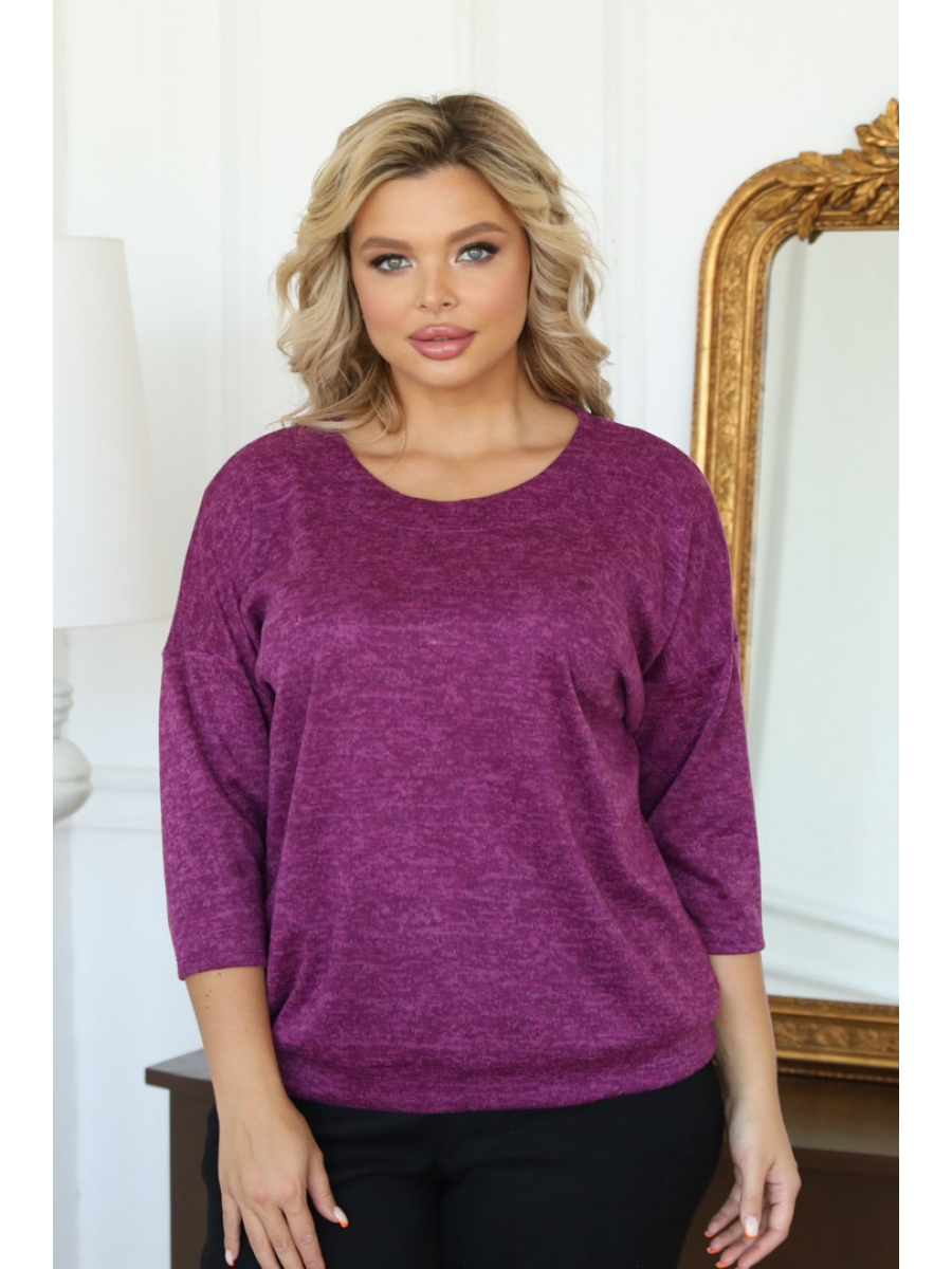 Очаровательная блузка свободного силуэта из трикотажного полотна сиреневого цвета. Круглый вырез изделия обработан внутренней обтачкой. Блузка со спущенной линией проймы и втачными рукавами. По низу изделия манжет. Длина изделия по спинке от плечевого шва до низа изделия — 68 см. Рост модели - 170 см.