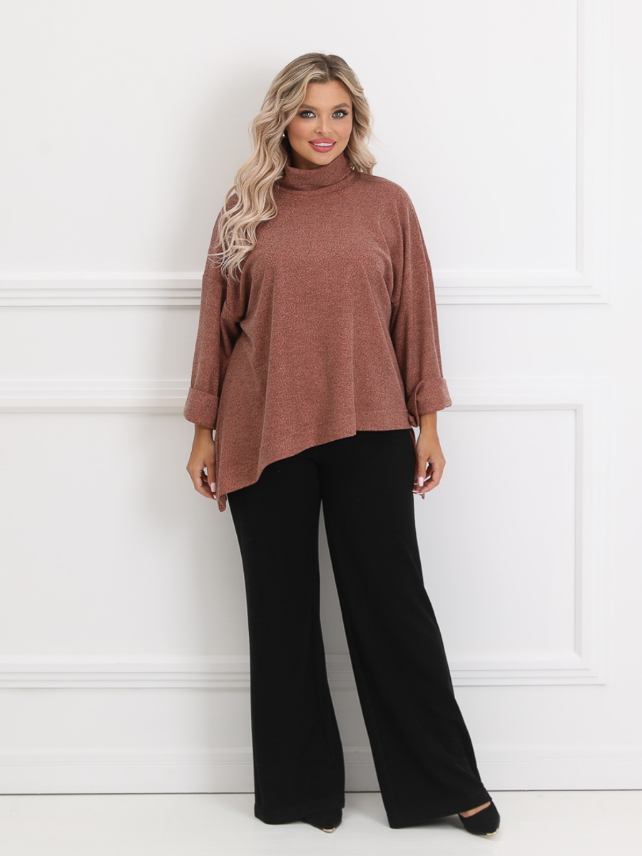 Стильный джемпер свободного силуэта из трикотажного полотна розового цвета. Круглый вырез изделия обработан воротником полустойка. Джемпер со спущенной проймой и втачными рукавами. Длина изделия по спинке от плечевого шва до низа изделия - 65 см. Рост фотомодели — 170 см.
