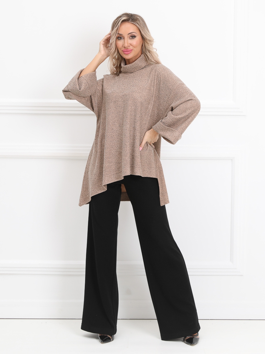Стильный джемпер свободного силуэта из трикотажного полотна бежевого цвета. Круглый вырез изделия обработан воротником полустойка. Джемпер со спущенной проймой и втачными рукавами. Длина изделия по спинке от плечевого шва до низа изделия - 65 см. Рост фотомодели — 170 см.