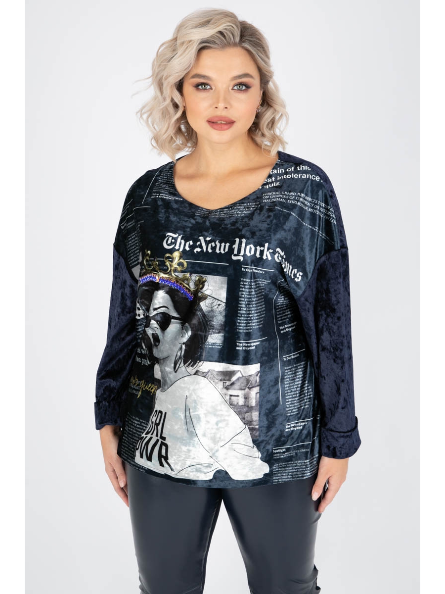 Стильный джемпер прямого силуэта из трикотажного бархата синего цвета. Круглый вырез изделия обработан внутренней обтачкой Джемпер со спущенной проймой и втачными рукавами. Аксессуары в комплект не входят. Рост фотомодели — 170 см