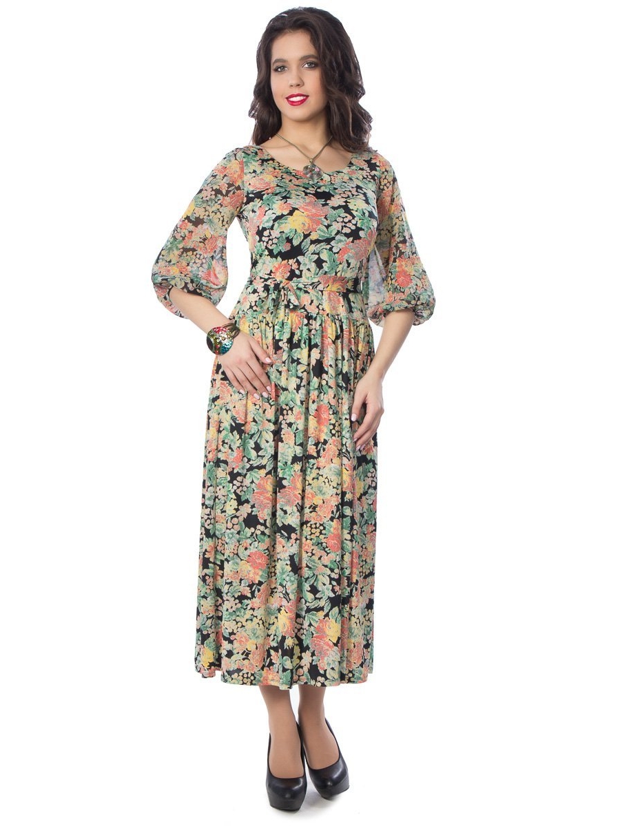 Интересное платье-макси полуприлегающего силуэта из трикотажного полотна черно-желтого цвета. Фигурный вырез изделия по спинке украшен ажурной кокеткой черного цвета. Втачные рукава обработаны окантовкой. Платье отрезное по линии бедер, юбка изделия дополнена складками. По боковым швам изделия — втачной пояс.