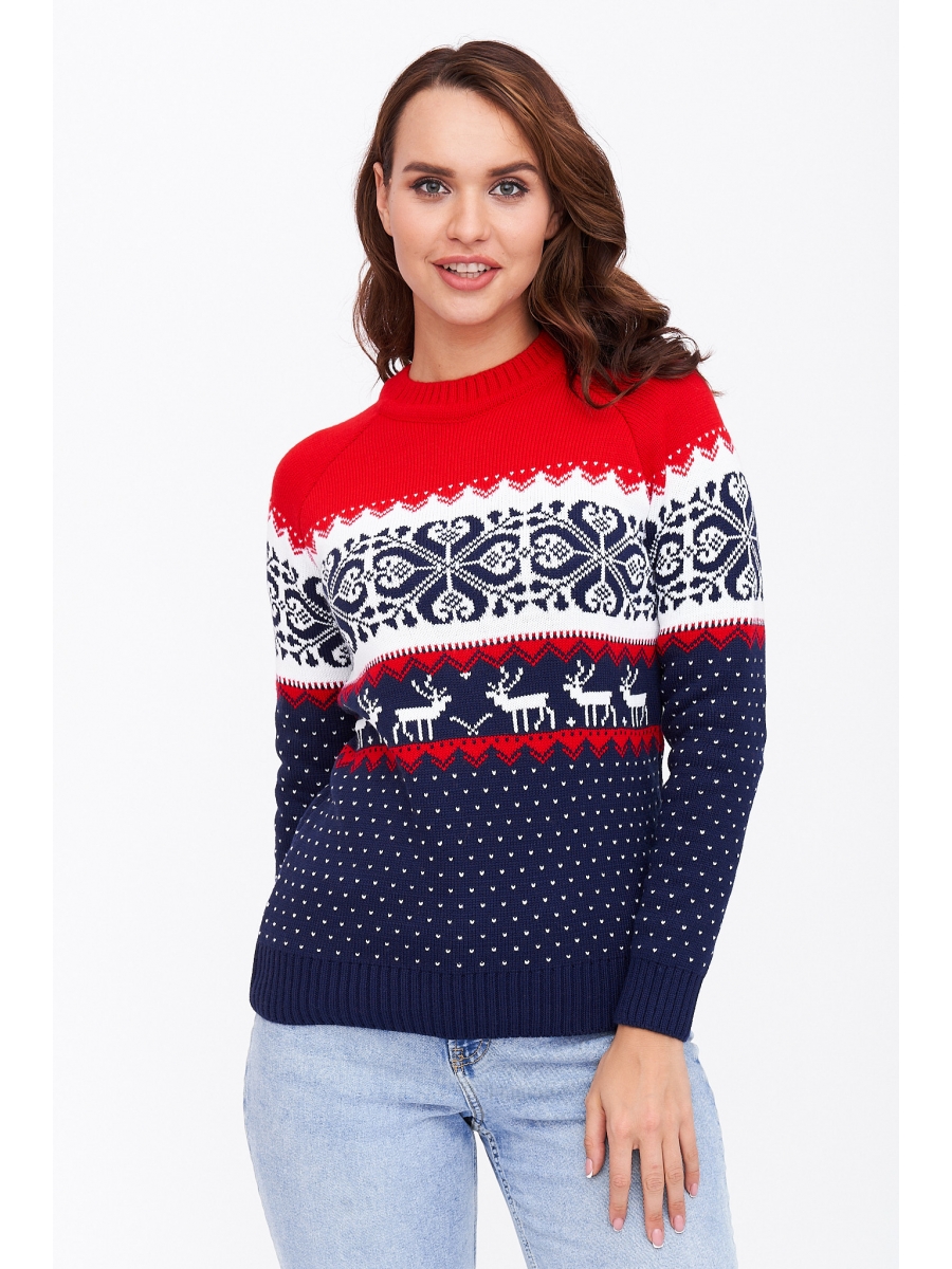 Оригинальный новогодний женский джемпер с круглой горловиной из тёплой мягкой пряжи с добавлением шерсти. Рукав реглан. Выполнен жаккардовым переплетением. Окутает вас тёплом в серые и холодные будни,придаст настроение праздника.