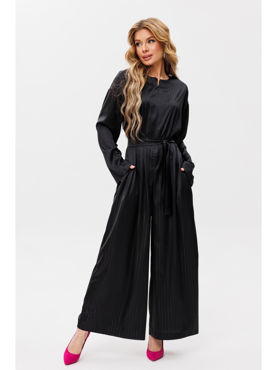 Комбинезон свободного силуэта со спущенным плечом и застежкой на потайную тесьму молнию с переди. Вырез горловины круглый. Рукав втачной длинный. В боковых швах действующие карманы. Пояс из основной ткани в комплекте.