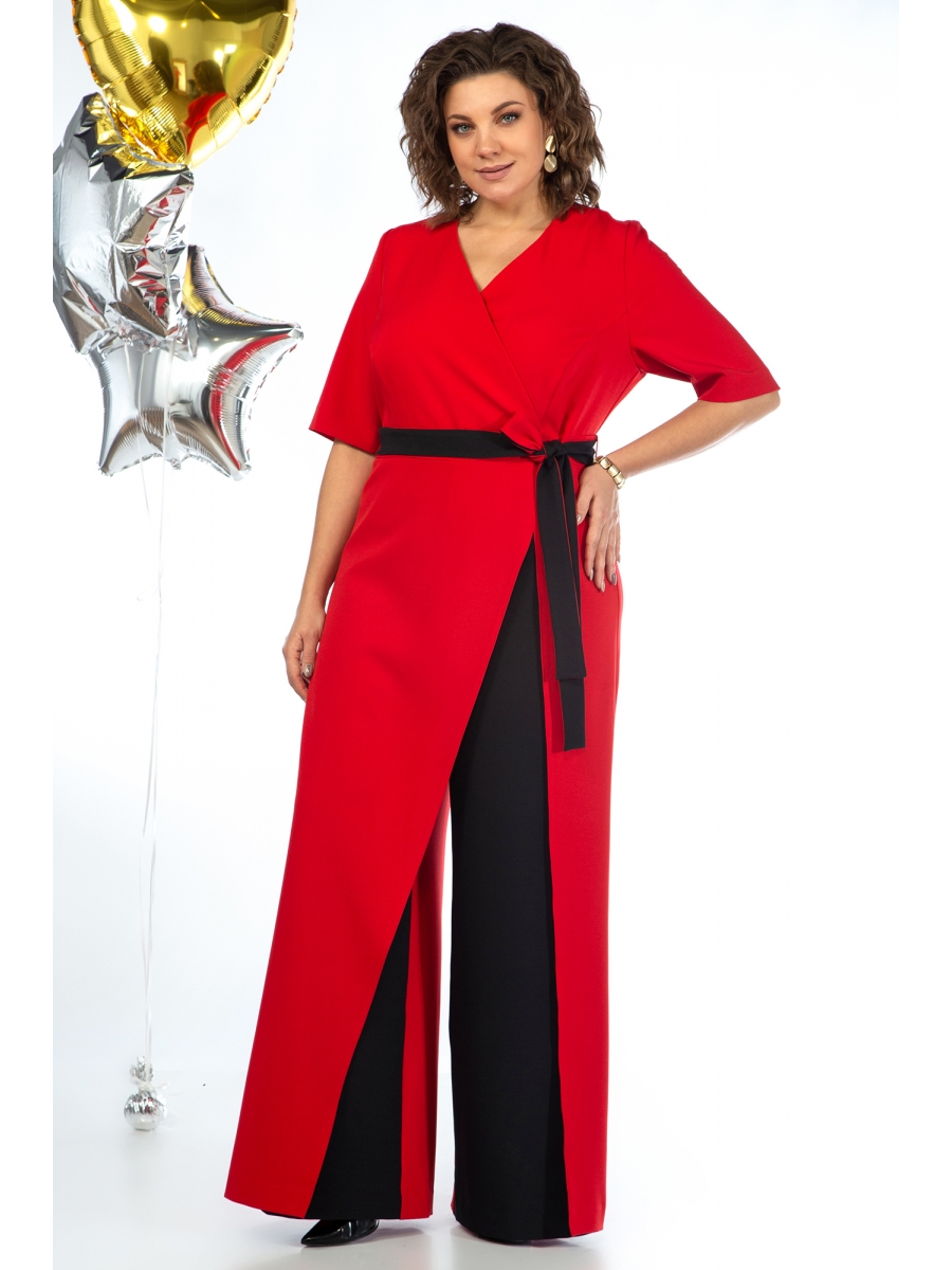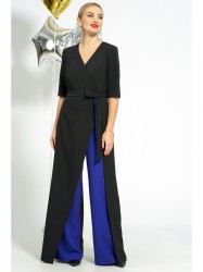 Комбинезон отрезной по линии талии с притачным поясом и съёмным завязывающимся поясом по линии талии. С застёжкой на потайную тесьму-молнию по среднему шву спинки.