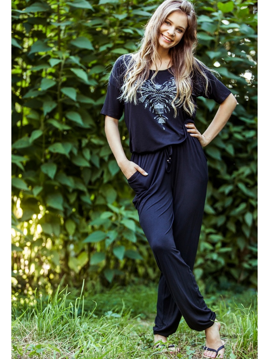 Комбинезон женский LHJ 841 от европейского производителя KEY. Длинный комбинезон с заниженной линией плеча, с коротким рукавом, декольте лодочкой и разрезом на спине. Удобная резинка на поясе и завязки с декоративными бусинами. Брюки-шаровары с мягкой резинкой на конце штанины.