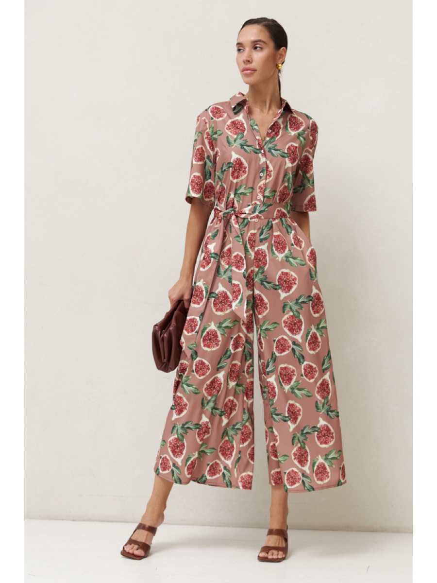 Стильный комбинезон из комфортной вискозной ткани. Свободный силуэт с застёжкой на пуговицы, в боковых швах карманы. Втачной короткий рукав. Вырез горловины обработан отложным воротником на стойке. Изделие с заниженной линией сидения обеспечивает комфортное движение. В комплекте пояс из основной ткани