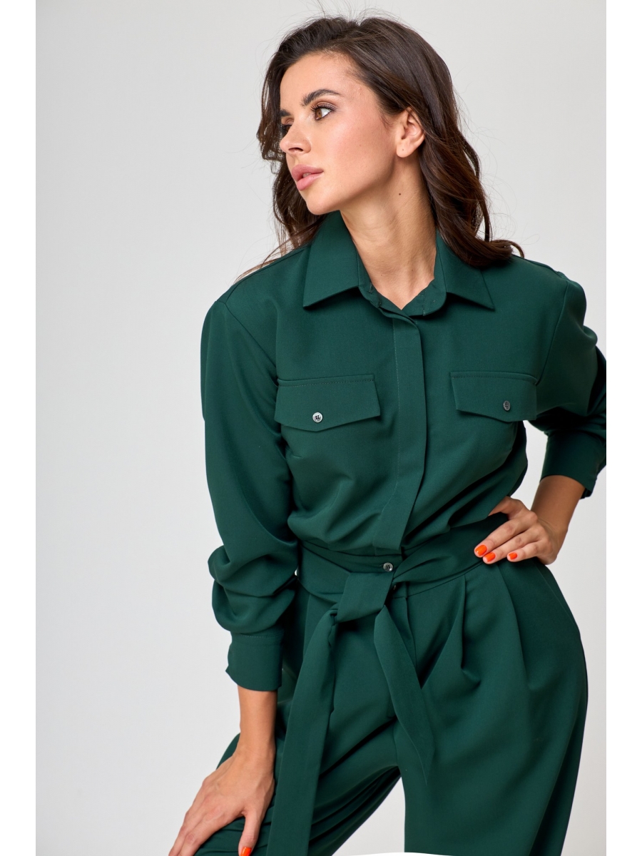 Комбинезон из костюмной ткани создает стильный образ как для каждого дня так и для выхода в свет. Комбинезон полуприлегающего силуэта, на передних частях обработаны нагрудные вытачки и клапаны, потайная застежка-планка на петли и пуговицы, спинка с кокеткой, по центру складка на свободу движения. Нижняя часть комбинезона выполнена на широком поясе, по переду заложены складки, застежка «гульфик». Обработаны боковые карманы, на задних частях обработаны талиевые вытачки и клапаны. Воротник рубашечного типа, на стойке. Рукава втачные, длинные, на притачной манжете, с застежкой на петли и пуговицы. В комплекте съемный пояс из основной ткани.