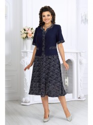 Жакет однобортный, прилегающего силуэта, выполнен из ткани «лен-вишер», с отделочными элементами из плательного шифона с принтом. Модель без подкладки, с плечевыми накладками. По горловине переда и спинки, краю борта и низу изделия – отрезные планки. Спереди обработаны рельефные швы, направленные от пройм до низа; в нижней части переда расположены отрезные отделочные детали. Перед с центральной внешней застежкой на 5 декоративных пуговиц с закруглёнными бортами внизу. Спинка со средним швом и рельефами, направленными от пройм до низа. Горловина спинки округлая, спереди – фигурная, углубленная. Рукав короткий, втачной, с манжетой по низу. Длина жакета – 56 см (50-54 р-р), 57 см (56-64 р-р); длина рукава (с манжетой) – 28 см.