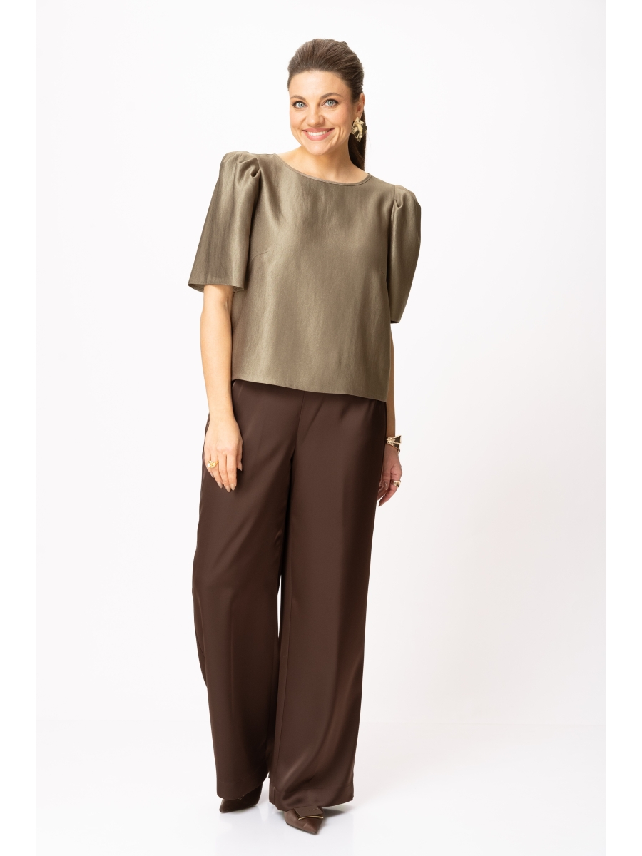 Блузка свободного силуэта из плательной ткани с блеском. Горловина круглая, по спинке в центральном шве разрез возле горловины с завязками. Рукава втачные с объемными складками по откату.